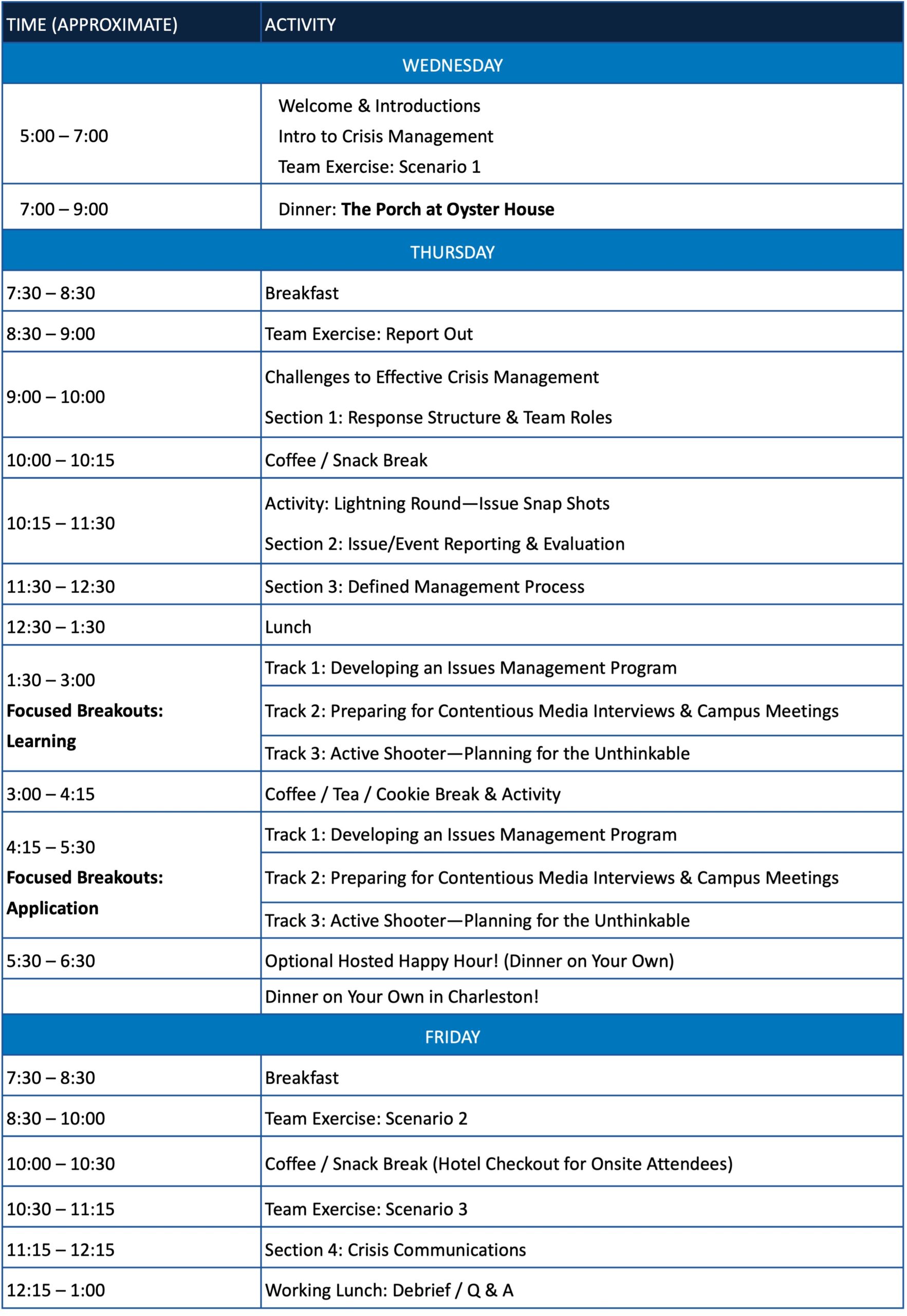 Join us in beautiful Charleston, South Carolina, for our Issues & Crisis Leadership Retreat. With a special focus on Proactive Planning and Issues Management, this workshop is a perfect opportunity to escape the campus chaos; engage constructively through scenario-based, hands on learning; and energize your institutions approach to issues and crisis response.